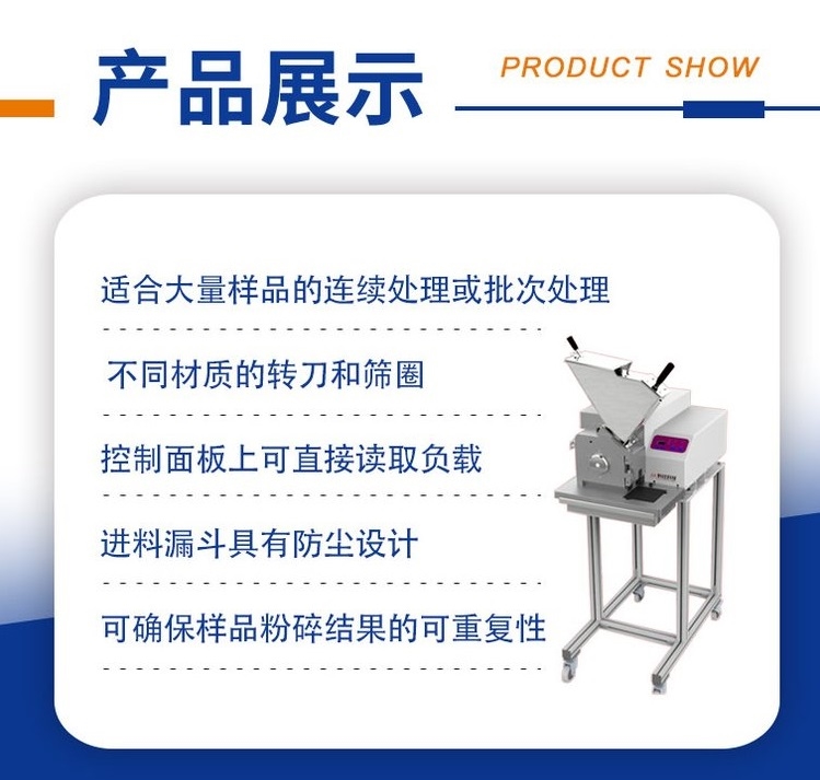 粉碎是通过转刀与切割棱及底筛之间的剪切作用实现的,样品通过进样漏斗进入研磨腔,在切割电机的高速剪切下,样品快速被粉碎,当样品尺寸小于底筛孔径的尺寸时,样品就会进入收集容器,从而完成样品的粉碎。