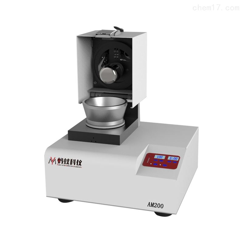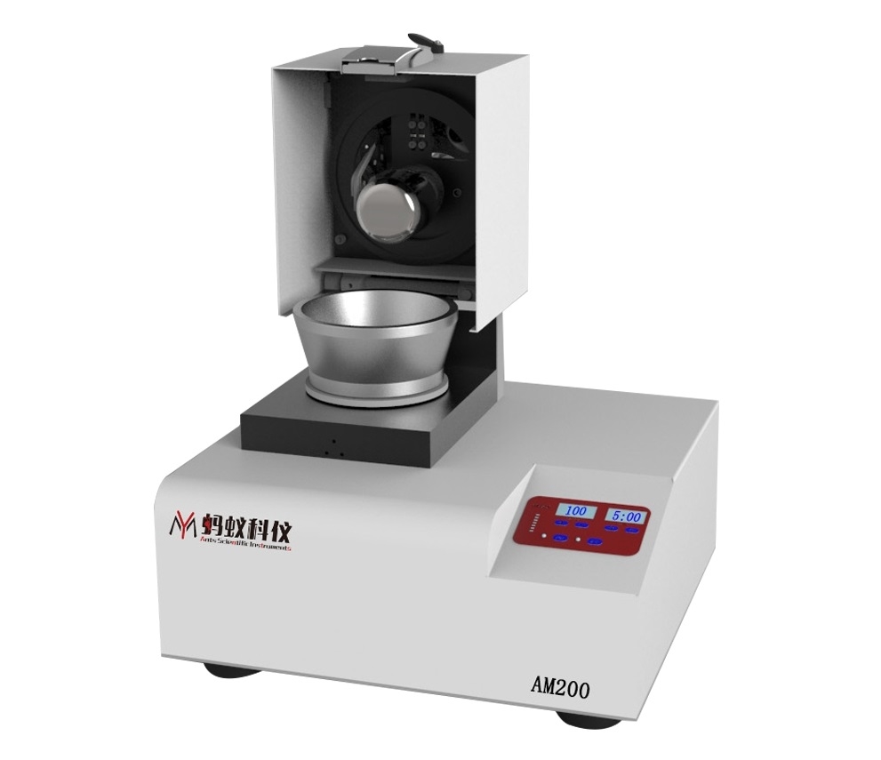 AM200臼式研磨仪以仿传统的手工研磨方式为基础,通过研钵和臼杵的摩擦和挤压,从而完成样品的粉碎。样品从进料口进去之后,沿着研钵运动的方向向内侧运动,碰到刮料板后,一部分样品向臼杵和研钵的上下接触面聚集,另一部分样品沿着研钵壁进入到研钵和臼杵的后侧接触面,这样的循环运动保证了样品的均匀性的粉碎。臼杵相对于研钵,属于偏心设计,一方面研钵带动臼杵转动,通过和样品的接触产生摩擦力粉碎样品;另一方面臼杵本身的重量以及作用在臼杵轴向、可调节的弹性力所产生的压力粉碎样品。